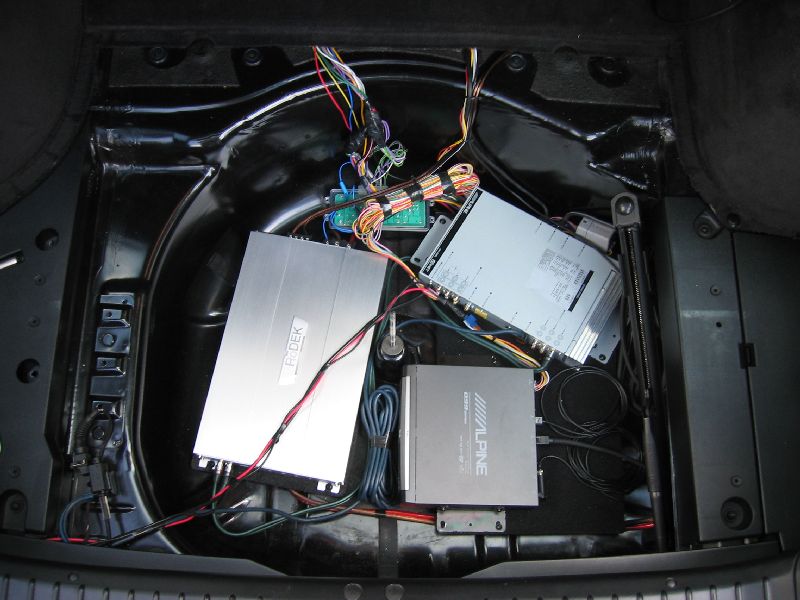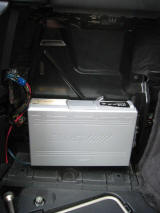 Verstärker Rodek R2175FRD, ein Digitalverstärker mit in dieser Konfiguration ein mal 359 Watt laut Werksangabe die Blackbox des IVA-D300RB mit BMW Hifisystemadapter (letzenendes ein spezieller High-Low-Adapter) und dem Alpine NVE-N099P Navirechner.