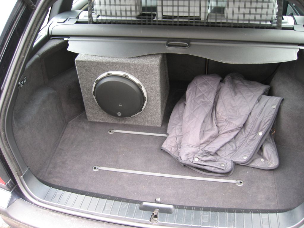 Nach einigem hin und her ist das H/K-System auch gleich mit rausgeflogen. Zwei Endstufen von JL-Audio (500/1 und 300/4) versorgen jetzt einen Sub: JL-Audio 10W6v2 im Gehäuse CVS110RG-W6v2 und 2 16cm 2-Wege-Systeme in den Originaleinbauplätzen in der vorderen Tür (HT im Spiegeldreieck) und im Kofferraum (HT in der D-Säule - einziger sichtbarer Lautsprecher) Vorne: Eton A1-160, hinten Eton RS 160.